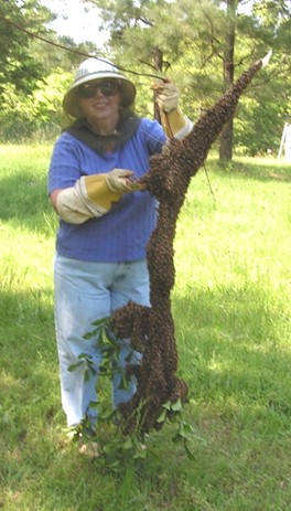 On Easter Sunday, after church, we had a swarm of bees on a low branch of a pine tree. Since Joyce enjoys shaking bee swarms to introduce them to their new hive, she took care of this swarm.