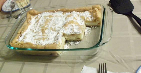 In saucepan heat water. Dissolve butter in water, then add flour and baking powder. Mix by stirring with only a wooden spoon, and then boil for 3 minutes. Remove from heat, and stir in partially beaten eggs. Continue stirring until the dough becomes a thoroughly mixed stiff ball. Divide the dough into two equal portions. Spread each half of the dough into an 8”x12” baking pan, and bake at 350 degrees for 30 minutes. Cool on racks. Note: For ease of removal from pans, line the pans with parchment paper.