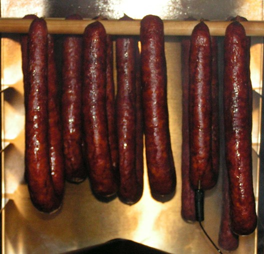 This mixture is stuffed into 32-36 mm casings, and smoked. At the conclusion of smoking, the internal temperature should have reached 152 degrees F.. Although it is now cured and considered safe to eat, it still requires refrigeration.